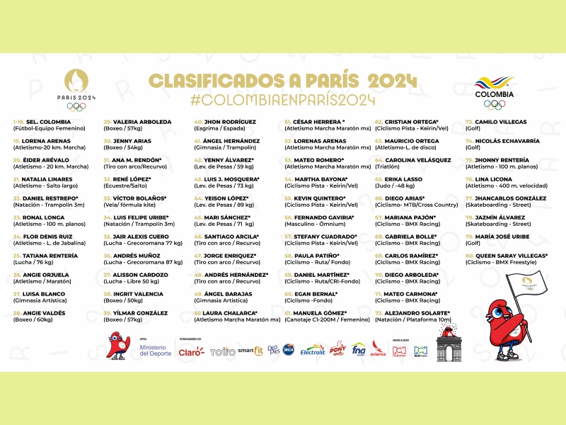 El camino a París 2024 comenzó con la Selección Colombia Femenina de Fútbol, que aseguró los primeros 18 cupos numéricos tras ser subcampeona de la Copa América 2022. Posteriormente, Lorena Arenas, medallista olímpica de plata en Tokio 2020, fue la primera en asegurar un cupo nominal, seguida por otros atletas destacados como Natalia Linares en salto largo, Daniel Restrepo en natación y Ronal Longa en los 100 metros planos.